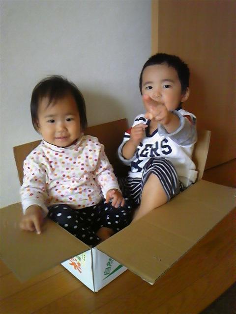 梨の入っていた箱で遊ぶ二人(笑)
