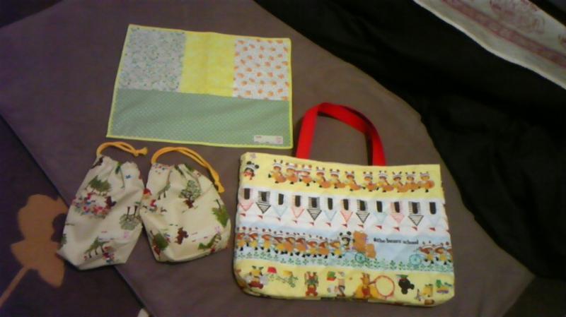 絵本バック、コップ入れ巾着二つ、ランチョンマット。