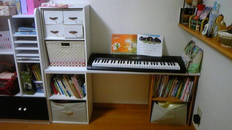 使っていたカラーボックスに買ってきた天板を渡してテーブルにしてみました。