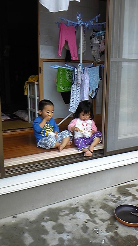 縁側でアイスを食べる二人(笑)