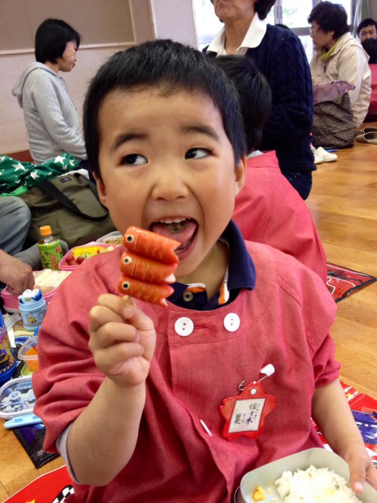 公園でお弁当の予定を変更して、幼稚園のホールでお弁当になりました(o^^o)