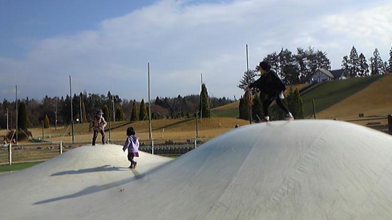 楽しみにしていた人工芝生ゲレンデでのソリあそびが濡れていて危険とのことでできなくて、ガッカリ。。