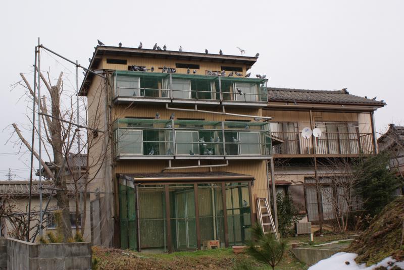 この鳩舎は、3鳩舎目で1989年に建てました。改造と建て増しを3回しています。1階は、分離鳩舎と配合室及び管理室で8坪です。2階は種鳩鳩舎2部屋で5.25坪です。3階は選手鳩鳩舎で2部屋5.25坪です。