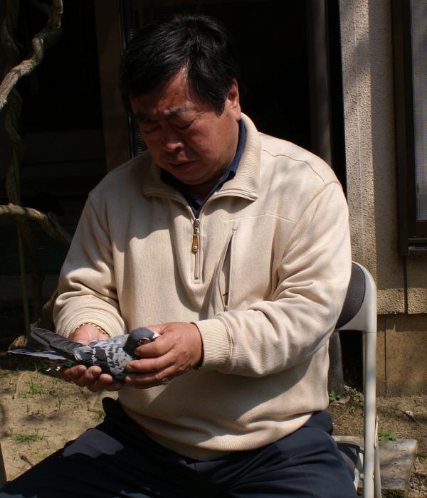 残念ながら、帰還鳩の写真には鳩は写っていませんでしたので、第一帰還鳩を遠路はるばる観戦に来ていただきました、実行委員長さんに第一帰還鳩を持っていただいた写真を掲載いたします。