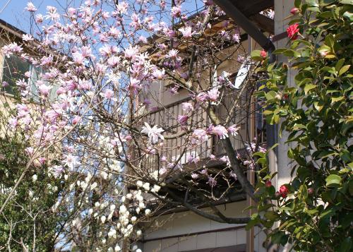 白モクレンと姫こぶしの花爛漫風景を添付します。---まだ桜はつぼみです。