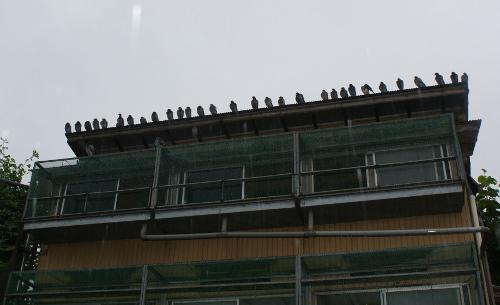 外に出て鳩舎を見ると屋根の上にずらりと並んでいました。急いで家に戻ってカメラを持ち出して撮りましたので「ブログ」に掲載します。