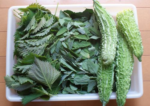 朝の給餌が終わったので、これまた久しぶりに野菜をあげるので、先程採った「アオザ」にプラスして「ゴーヤ」「青しそ」を収穫しました。