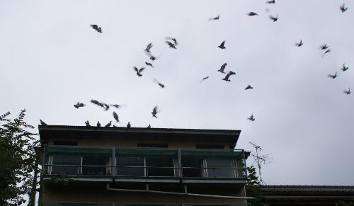 外に行ったら、7羽は大空高く飛んでいましたが、その他の鳩君は低空飛行か屋根に止まっていましたが驚いて全部一度飛び立ちました。