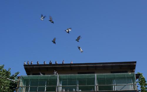 鳩舎に行ったら一羽も帰ってきていないので、ガツカリして選手鳩以外の餌を与えて外で見ていました。