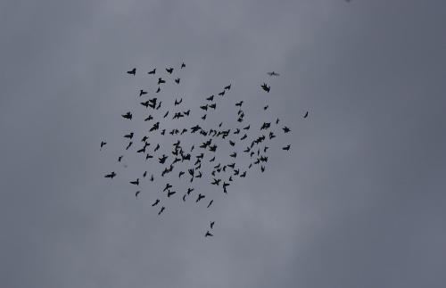 空を見上げると、集団に追いつけない鳩が3羽集団のしたを飛んでいて、集団に一生懸命追いつこうと頑張っている鳩くんが4羽見えます。