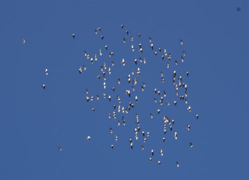 15分位経った頃に久しぶりに遠征を試みました、30羽の鳩くんを残し消えて行きましたが10分位で戻って来て、又、一塊で飛んでいます。