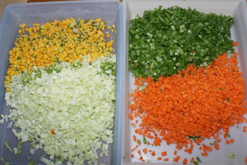 買って来た三点+管理人の家庭菜園で収穫した「かぼちゃ」の四点を食べ易い大きさに切りました。