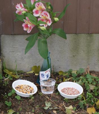 管理人は、昨夜「岡ちゃん」が「009号」のお墓にと言う事でお花をいただきましたので、水と餌と鉱物飼料を新しくしてお花とお供えしました。