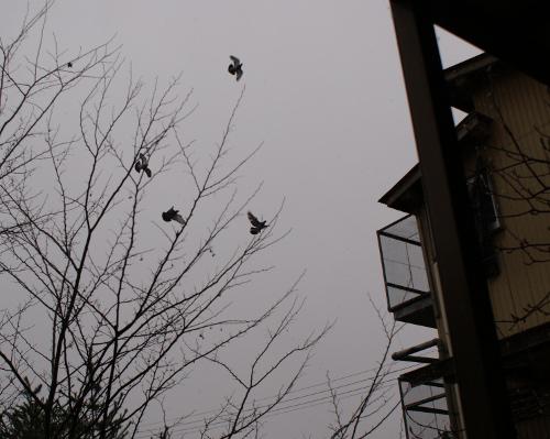 その他の鳩くんは一塊で飛んでいます。まだ、雪も降り出さなくて良い按配です。