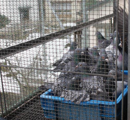 選手鳩くんの給餌を終わらせてから一階の管理室のゲージ内の鳩くんの水を「湯たんぽ」の水に交換してから餌を与えました。