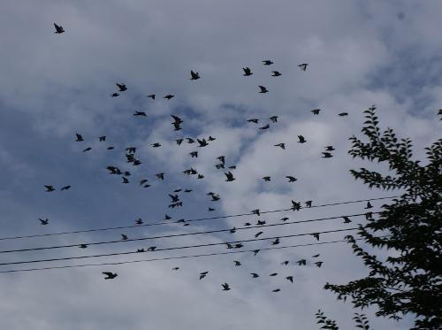 更に、上の集団も二つに分かれて、一番下には「降りたい組30羽位」と上空の「飛びたい組50羽位」と真ん中には「どちらにしようか迷っている組50羽位」の3つの集団で飛んでいます。