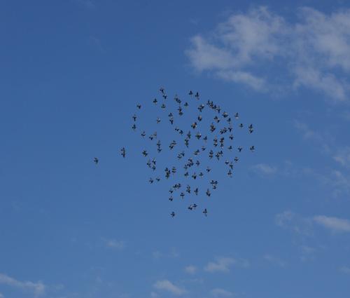 鳩くんたちは屋根にも止らずに全鳩飛び立って大空を集団で飛んで居るので管理人はしばらく監視することにして15分ぐらい見ていましたが降りる気配もなくて昨日も小一時間飛んでいたので舎外は鳩くん任せにして他の鳩くんの給餌を始めました。