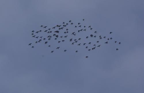 一日分の給餌を終わらせて、外の鳩くんを見に行くと鳩舎の屋根に何羽かが止っていたので「まだ早い」と思って竿で追って飛んでもらうと13羽の鳩くんが飛び立ちました。飛び立った鳩くんたちは、集団で飛んでいる鳩くんたちに3分位で高度が同じになって吸い込まれました。時間を確認すると10時40分で舎外を始めてから一時間一寸経っていました。