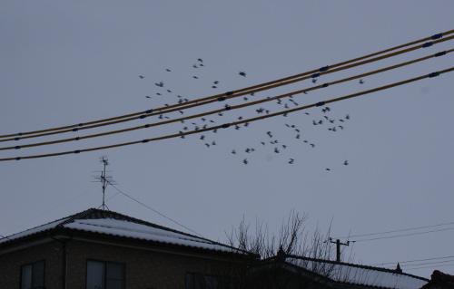 管理人は相変わらず「コタツ」に入って血統書作りですが、たまに窓越しで鳩くんの様子を見ると丁度150m先の電線に鳩くんの集団が通り過ぎようとしてると後ろの下の鳩くんが突然おちて行きましたので、又上がってくると思って先の家並みを見ていましたが上がってこないので来ません。