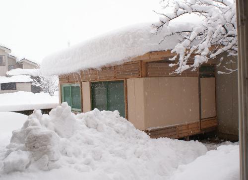 ウトウトしながら雨戸の隙間から感じる天気は、今日も雪のようです。7時ごろにやっと起きて来て外を見るとやはり雪が降っていて、昨日から新たに20Cm位積もって入るために庭木の小枝までに雪が積もって幻想的な風景でしたが、その先の駐車場では嫁さんが「雪かき」をしている姿が見えました。