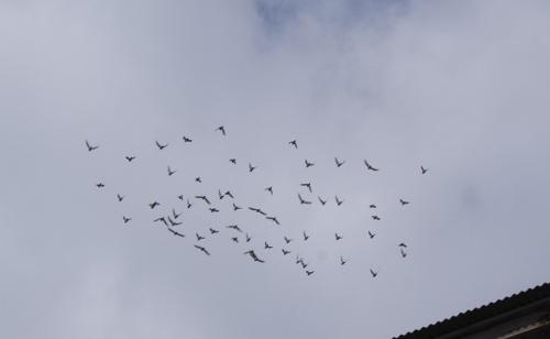 時計を見ると10時だったので、50分飛んだ計算になるのでもう少しだと思ってみていると鳩くんたちが戻ってきたのが見えたと思ったら直ぐに見えなくなってしまいましたが、その後鳩くんが4羽6羽とばらついて飛んでいるので「猛禽くんのお出まし!」と思ったら、「隼くん」が諦めて優雅に東の山の方へ飛んで行きました。
