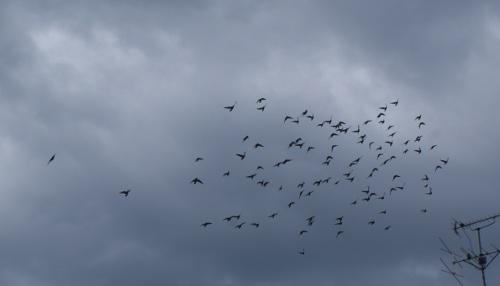 降りて来て、久し振り竿を出して追うと雛鳩くんたちは驚いて飛び出しましたので、空を見上げると100羽位の鳩くんが飛んでくれたので急いで「カメラ」を取りに行って「舎外風景」を撮影しましたので「ブログ」に投稿します。