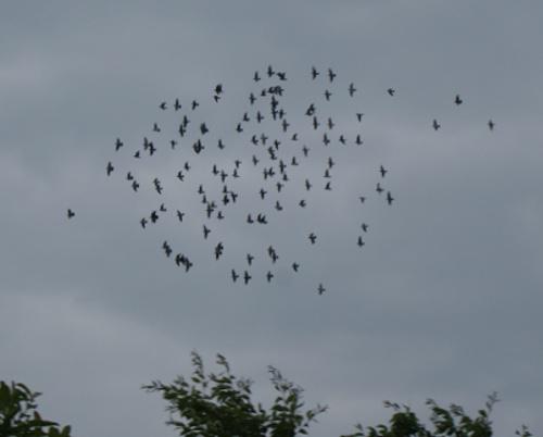 やっと全鳩くんが一塊で飛んでくれたので、喜んで飛んでいる写真を撮りましたので「ブログ」に投稿します。写真に写っている鳩数を数えると130羽以上いたので「S♂くん」以外は一塊で間違いなく飛んでいました。