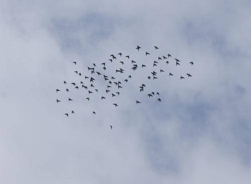 しばらく見ていると、上の集団が下に降りて来て一つの集団になって飛び始めて、今度は10羽を残して空高く飛び始めて見えなくなったので初遠征にいったようです。
