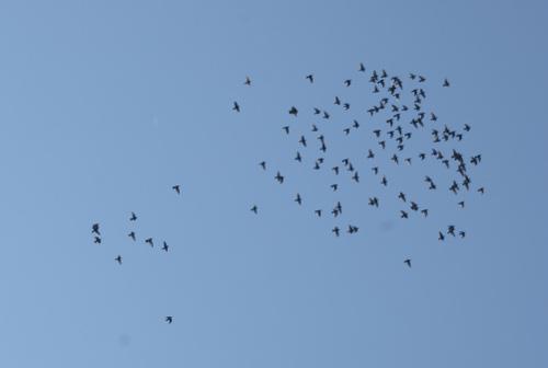 その時に「カラスくん」が鳩舎の屋根に偵察に来たので、驚いて鳩くんたちが飛び立ったので管理人は降りて来て、飛んでいる鳩くんたちを観ると前から飛んでいる集団に混じって30〜40羽位の鳩くんたちが飛んでいたので、一旦家に戻りました。