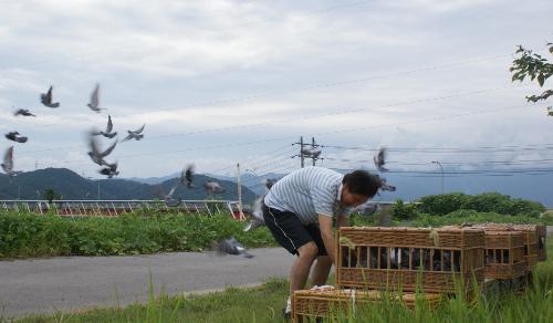 始めてなので、出ない鳩くんもいたので手で追い出して上げていると、嫁さんが「もう鳩は見えない!」と言うので「まだその辺にいるよ!」と管理人が答えて捜すと、山の方向の「加治川」の上で一塊で方向判定をしているので「其処の川の上にいるよ!」と教えてあげて、「一羽遅く出たのが追いかけているよ!」とのん気なことを言っていると、その鳩くんと思っていたのが集団に近づくと一回り大きくて「猛禽くん」のようで、鳩くんたちの集団はバラバラになりました。