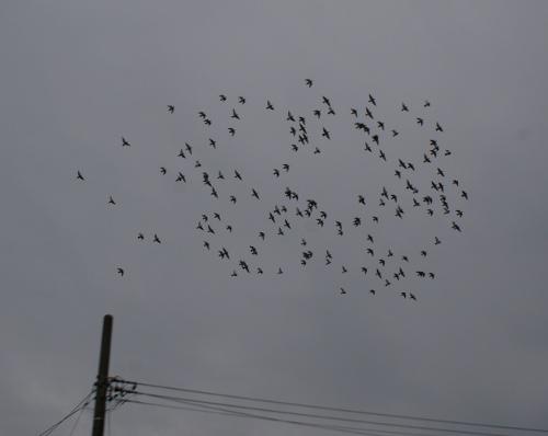 気分良く「出舎口」は閉めましたが、昨日訓練したので今日は鳩くんなりの舎外にしたいので「入舎口」は閉めないで降りて来て、選手鳩くんの様子を見ると曇り空の中一塊で高く上がらずに飛んでいました。