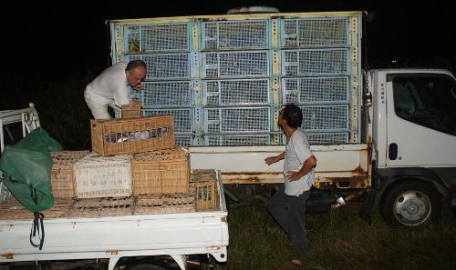 20時5分前に到着すると「哲ちゃん」がケージに鳩をつめていました。管理人は「哲ちゃん」が終るのを待って、車を横付けにして少しでも楽に降ろせるようにしました。
