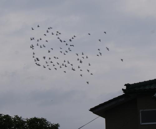 今日から、先日怪我をして休養中だった「B♂くん」と先週後日帰りした「BC♂くん」の二羽を今日から舎外に出したので、飛び具合が気になったので鳩くんたちを捜すと、曇り空の中集団で飛んでいましたが一羽一生懸命追いかけていました。羽色から「B♂くん」だと直ぐに分かりましたが5分もすると諦めて降りて来ました。でももう一羽の「BC♂くん」は分からないので一緒に飛んでいて一塊で飛び始めました。