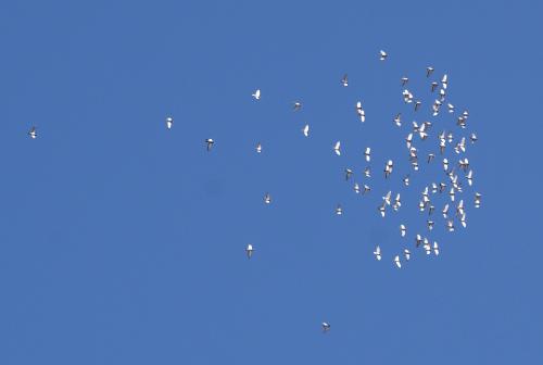 止む無く、車から「バスケット」を降ろして片付け終わってもまだ鳩くんの姿は見られず、離れた「♀分離鳩舎」の踊り場と飛散した「抜け毛」を回収終ると一羽10時38分に帰って来ましたが一羽だけです。60Kを98分掛かって一番手が一羽とはと嘆いていると嫁さんから「沢山帰って来たよ?」と声が掛かったので空を見上げると4〜50羽位の集団が姿を現して遥か上空を飛んでいると、そこに4羽3羽2羽と次々に集団に飛び込んでくるので、近いところで「猛禽くん」に攻撃されたと思いました。