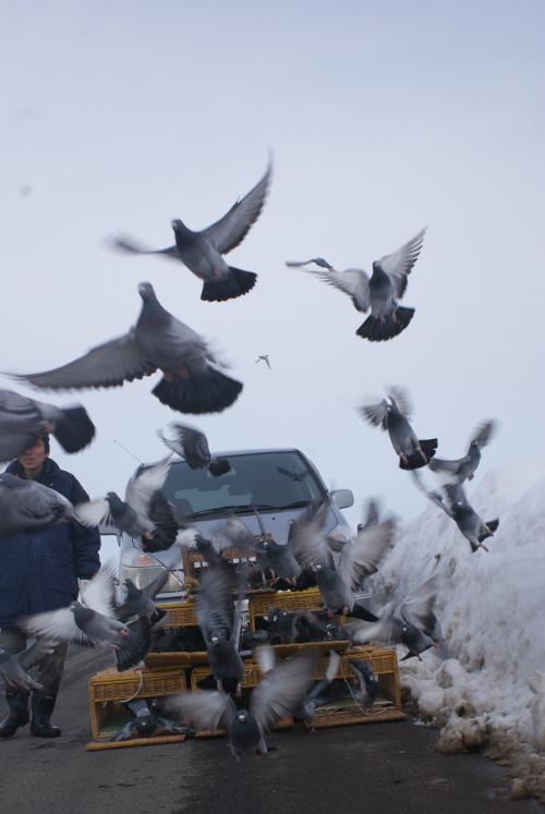 管理人は、飛び出した鳩くんたちが一塊で飛んでいるのを確認したら、急いで「バスケット」をしまいこんで逃げるように放鳩地を後にしました。