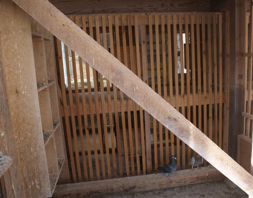 外は快晴で気分も軽やかに選手鳩舎に直行して、まず「餌箱」を見ると手前の「♂鳩くん」の所は「大麦」がほんの少し、奥の「♀鳩くん」の所は沢山残っていたので食い込み良くありません。餌はそのままにして奥の「♀鳩くん」を「展望台」集めてから外に出てもらうと全鳩くん無事に飛び立ってくれました。