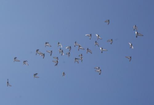 奥の「♀鳩くん35羽」を「棒」で追って外に出てもらうと今日も屋根にも眼をくれずに飛び立ってくれましたので、気分良く手前の鳩舎に居る「♂鳩くん」を奥の鳩舎に移動してもらってから「飲水器」を回収して下りて来て「駐車場」から飛んでいる「♀鳩くん」を探すと「青空一杯」の中で気持ち良さそうに一塊で飛んでいましたが、その風景は主翼の羽ばたきが「太陽くん」の陽射しに「キラキラ」反射して管理人が「舎外」を見ていて一番綺麗に感じる風景です。
