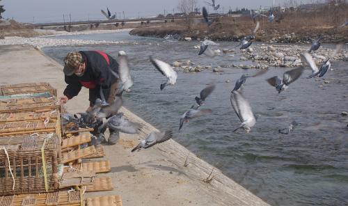 待っていましたが、今日は何所の鳩くんの姿が確認できません。9時を過ぎても確認出来ないので9時30分まで待たずに9時20分に放鳩すると一塊で「2〜3分」で海岸線を北上して消えて行ったので二人で「高帰還率」を確信しました。放鳩時の写真を撮りましたので「ブロク」に投稿します。