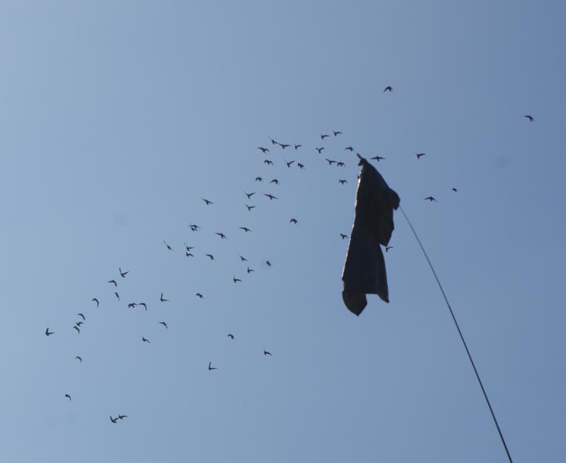 今日は屋根には止まらずに全鳩飛び立ってくれたので「出舎口」と「入舎口」を閉めてから「蚊取線香」と「飲水器」を回収しながら下りて来て「釣竿」を持ち出して延ばしてから隣の空き地の物置に立掛けて、手抜きをしようと思って下りて来てから飛んでいる鳩くんの様子を見ると、今日は大きな集団を「4羽から5羽」の鳩くんが追いかけていました。
