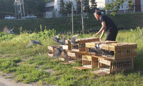 管理人もやっと出かけられる体調になったので6時15分に「春ちゃん」の運転で出発しました。「R7号線沿い」の「菊水酒造」に着いて「バスケツト」を下ろすと6時35分だったので15分休んで6時50分に飛ばすことにして待機しましたが、「春ちゃん」に飛ばしてもらって管理人は「カメラ撮影」をする事にしました。6時50分に成ったので「バスケツト」を開けましたが始めての鳩くんは出て行きません。「9個」の「バスケツト」が開いても何羽も出て行かない所を「カメラ」に収めましたので投稿します。追って「バスケット」を持ち上げてやっと全鳩出てもらうと上空で方向判定をしている集団がいたので皆吸い込まれて一つの集団になり方向判定を始めました。