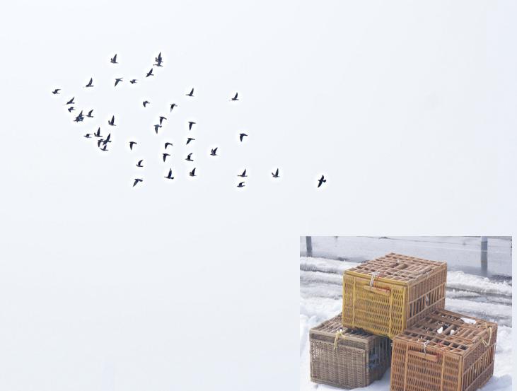 昨晩は「雪」が降らなかったので「雪かき」が必要なくて良かったですが、「放鳩車」の屋根の雪は落としていなかったので雪をおとしてから凍結している「飲水器」を回収して熱湯を掛けて融けるのを待つことにしました。その後に今日のメイン行事の「選手鳩くんの訓練」の準備を始めて一羽一羽番号を控えて「小さいバスケット」に詰め込んでから下ろして「大きなバスケット」に移して車に積み込みました。
