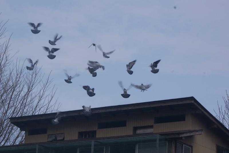 久し振りにユックリ見られるので楽しみでしたが中々戻ってこなくて痺れを切らした頃に、遥か上空に20羽位の集団が現れました。「来た?」と思って「カメラ」を構えて全部の鳩くんが入った良い写真を撮ろうと待ち構えましたが中々下りてこなくて、やっと下りる瞬間の良い写真がとれましたので投稿します。