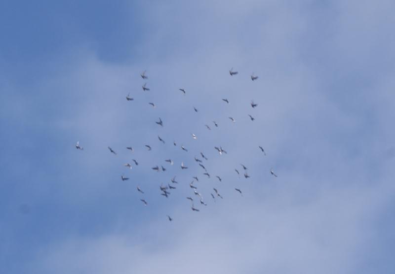 遅れた鳩くんたちも集団に交じって飛ぶようになったので、管理人のこの「舎外風景」を「ブログ」に乗せようと思い「カメラ」を取ってきて写真を撮りましたので投稿します。その後も鳩くんをみまもっていましたが、15分もすると時間がもったいなく思って一寸目を離して戻って来ると「2羽」下りそうな姿勢だったので慌てて「釣竿」を振り回しましたが、それでも無視して一羽下りてしまいました。