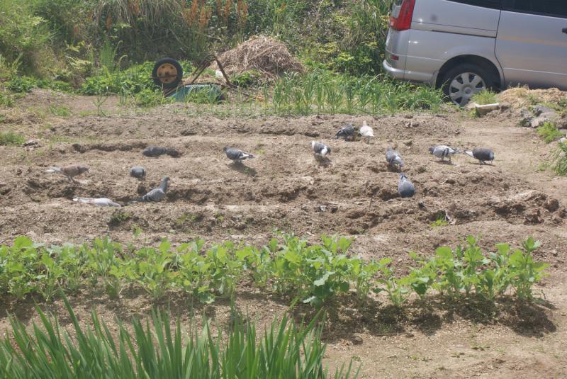 一時間も経つと「カラスくん」は諦めて何処かに行ってくれると、残った「雛鳩くん」は何もなかったようにリラックスして鳩舎の屋根、母屋の屋根で遊んでいると思うと、我が家の「家庭菜園」で何十羽も下りて遊んでいるので、これは面白いと思って「写真」を撮りましたので「ブログ」に投稿します。