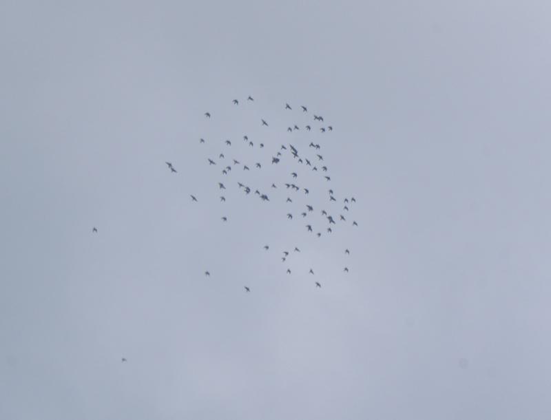 「第一選手鳩くん」は今日「舎外」を9時頃に始めましたが「ニ種混合ワクチン」接種前の状態にはまだ戻らなくて「2羽」の鳩くんが集団の中に入れなくて後を一生懸命追っ掛けていましたが「1羽」は諦めて急降下して鳩舎の屋根に下りて来ました。この時に高く上がって飛んでいる「第一選手鳩くん」の写真を撮りましたので掲載致します。