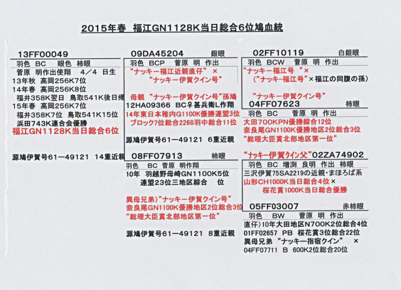 「福江GNレース」は優勝鳩舎がお隣の連合会の「H鳩舎」が分速「1726m」で優勝して「A&Kさん」は残念ながら2位でした。管理人は6位に入賞することが出来てラッキーで鳩くんに感謝感謝です。帰還した鳩くんの血統を添付しますので見て下さい。