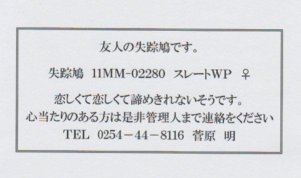 今日は、書き始める前に皆様にお願いがございます。新潟市内の友人が大事な鳩くんを逃がしてしまったので管理人の「ブログで掲載して下さい」とのたってのご依頼なので、鳩番号等見えやすい一面に表示しますので心当たりのある方は管理人まで連絡を是非お願いします。