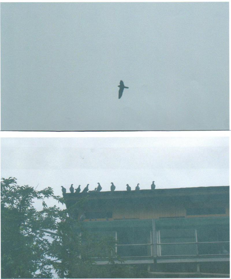 シャッターチャンスを逃した管理人は、「ブログ」に掲載しようと思って、まだ上空で狙っている「隼くん」と鳩舎の屋根に逃避した鳩くんの写真を撮りましたので「ブログ」に掲載します。---鳩くんの気持ちを考えない薄情な管理人でした。