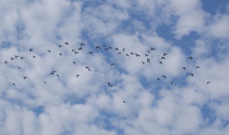 外に行って「釣竿」を鳩舎の屋根目掛けて振り回すと、飛びたくない鳩くんが「2羽」飛び立って直ぐに集団に追い着いて一塊で飛び始めました。最初は鳩くんも管理人も何時「猛禽くん」が出てくるか心配していましたが、何故か姿を現しません。