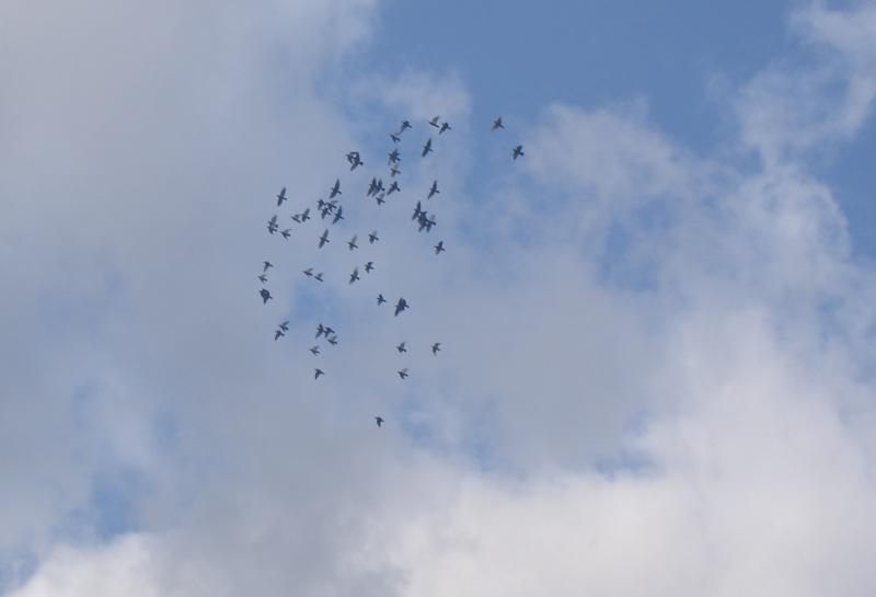 一時間位経過した10時30分頃に成ると飛んでいるのは「20羽」位で殆んど下りて屋根で遊んでいたので「釣竿」を振り回して再び飛んで貰って安心しきって見ていると、上空でスピードが一段と上がって集団が割れ始めたので周りを見回すと「隼くん」の出没です。